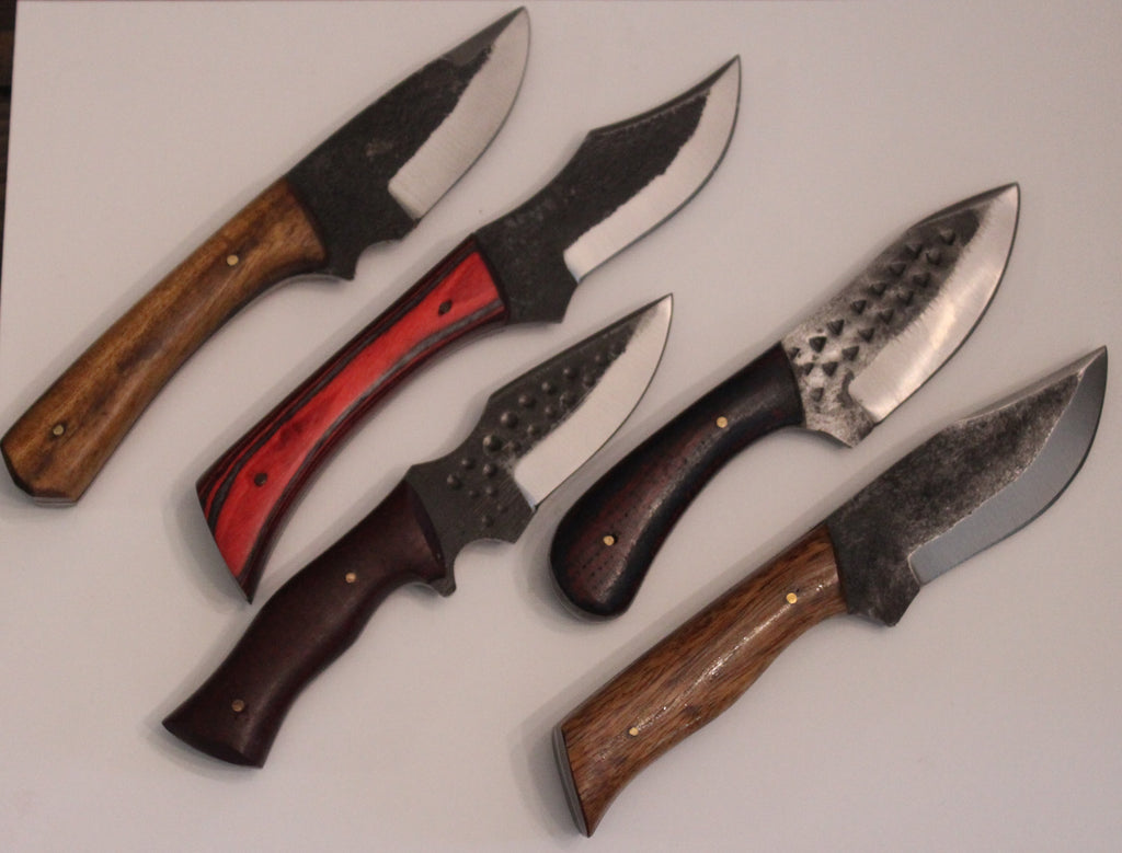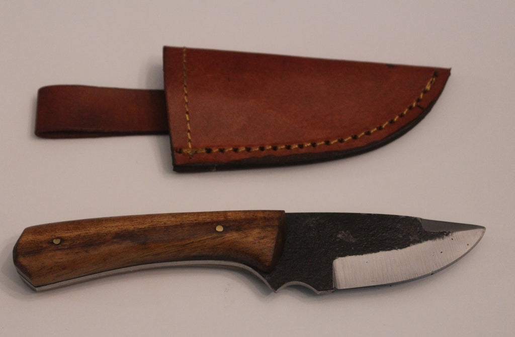 Hand Forged Blacksmith Knife - Assorted Styles - High Carbon Steel Blade * Wood Handle * Leather Sheath. Measures about 6" in length.